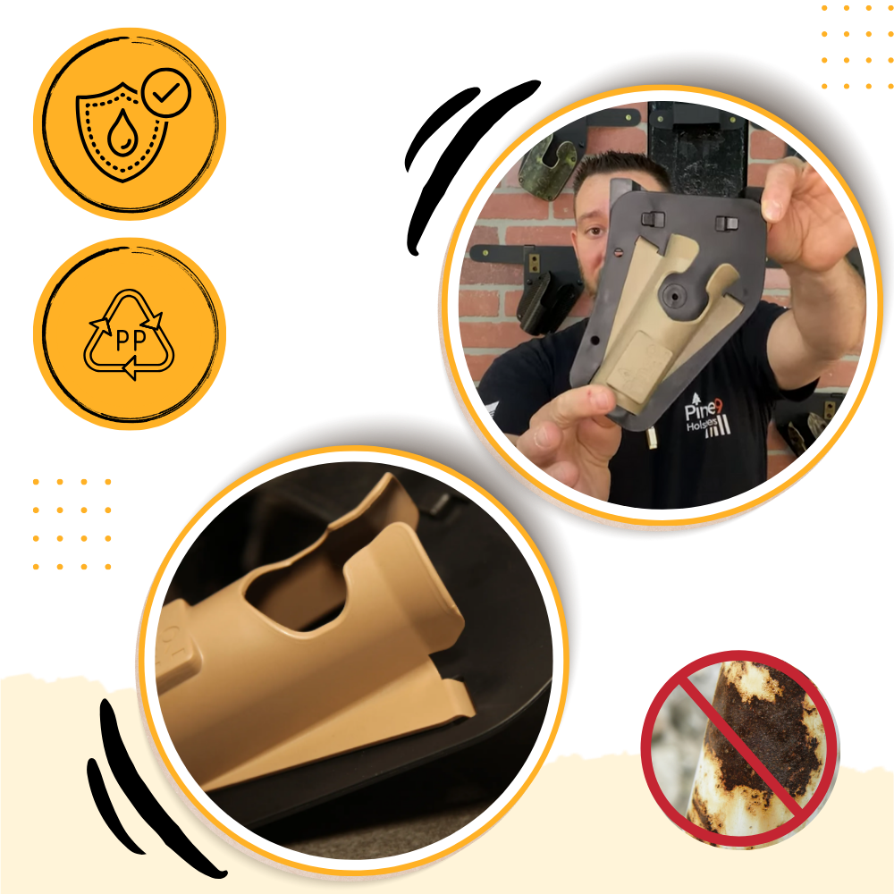 A differenza dei tradizionali portacanne che usano viti, cerniere o staffe metalliche, la Fondina da Pesca con Gancio è progettata senza componenti in metallo. Il suo corpo è realizzato interamente in polipropilene riciclabile e plastica HDPE , gli stessi materiali durevoli e resistenti usati per l’attrezzatura outdoor e le applicazioni marine. Questo garantisce che la fondina non arrugginisca né si corroda nel tempo, specialmente a contatto con l’acqua, ed è inoltre ultraleggera e praticamente esente da manutenzione. Per i pescatori che operano in ambienti umidi, fangosi o piovosi, questa struttura completamente in plastica è sinonimo di tranquillità e affidabilità duratura.