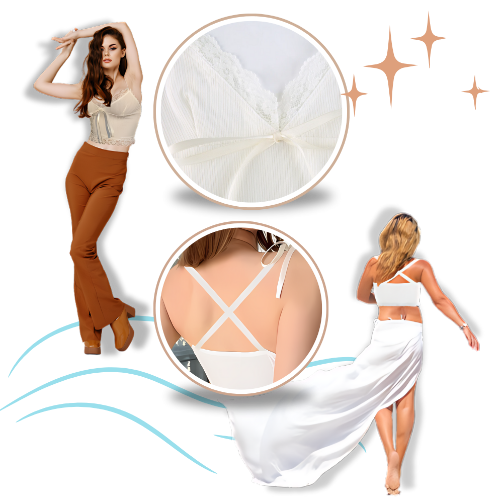 Il design incrociato sulla schiena di questo top in pizzo morbido ed elegante aggiunge un tocco di stile e funzionalità alla sua struttura. Questo dettaglio di design non solo offre un'attrattiva visiva, ma migliora anche in modo significativo la libertà di movimento, rendendo il top ideale per una serie di attività. La caratteristica dello schienale incrociato crea un elemento visivo di grande impatto che cattura l'attenzione, offrendo una dichiarazione di stile unica che lo differenzia dai tipici top senza schienale. È perfetto per chi apprezza un mix di moda e funzionalità, in quanto consente di muoversi facilmente pur mantenendo un look chic e moderno.