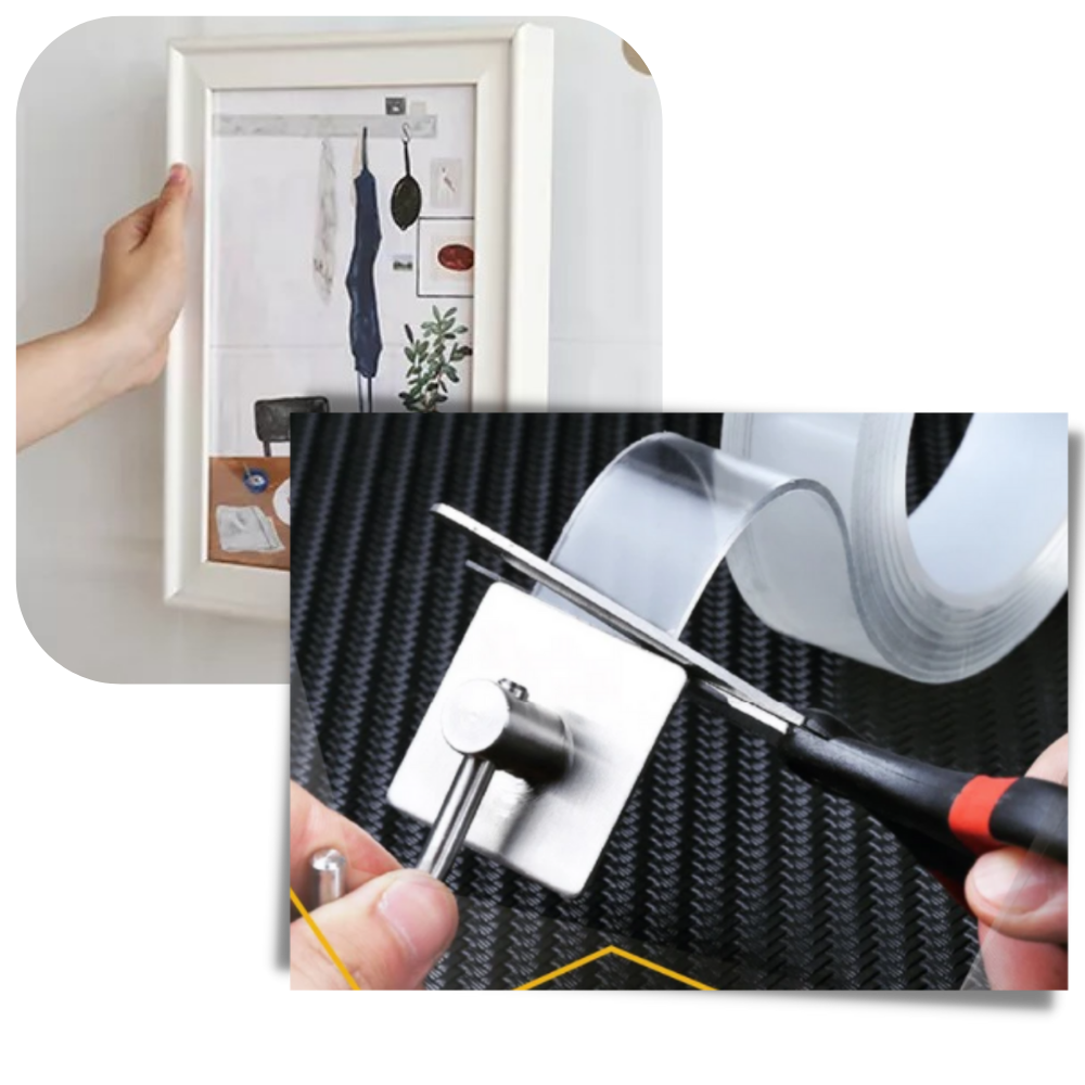 Niente più buchi o crepe nelle tue pareti. Il nastro magico vi aiuterà a mettere quasi tutto sul muro. La nanotecnologia permette al nastro di adattarsi all'oggetto. Quindi, qualunque sia la forma del vostro oggetto, il nano-nastro si adatterà ad esso. L'adesivo lo avvolgerà e si attaccherà con forza estrema.