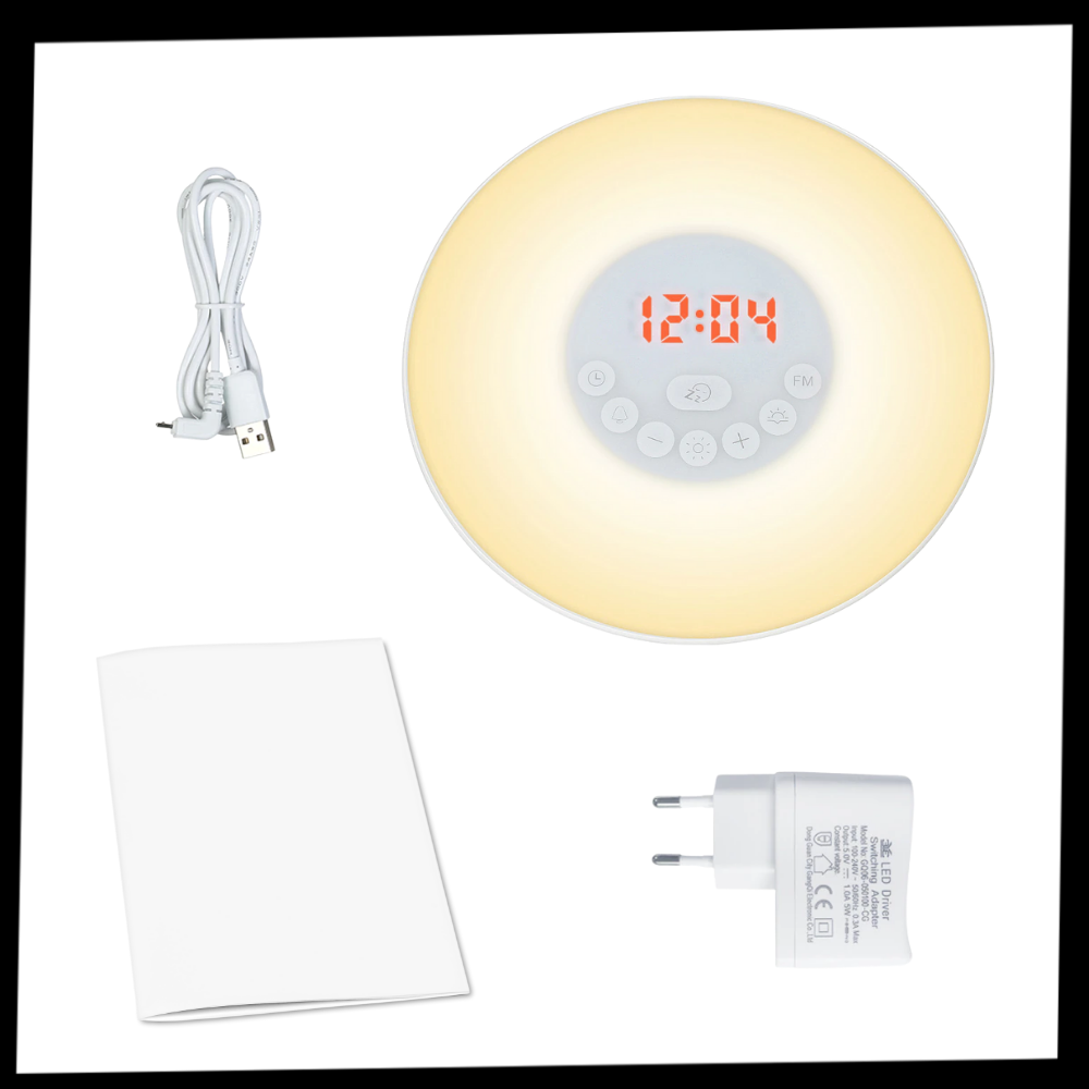 Grazie alle luci bianche calde e RGB LED incorporate, questa incredibile sveglia imita i naturali cambiamenti di luce durante le ore del mattino e della sera. Svegliatevi dolcemente grazie alla luce calda naturale che si illumina gradualmente per incoraggiarvi a svegliarvi. Grazie al suo design unico, le luci integrate diminuiscono gradualmente durante le ore serali per imitare un vero tramonto. Nel momento in cui le luci si spengono, starai dormendo bene. Non è fantastico?